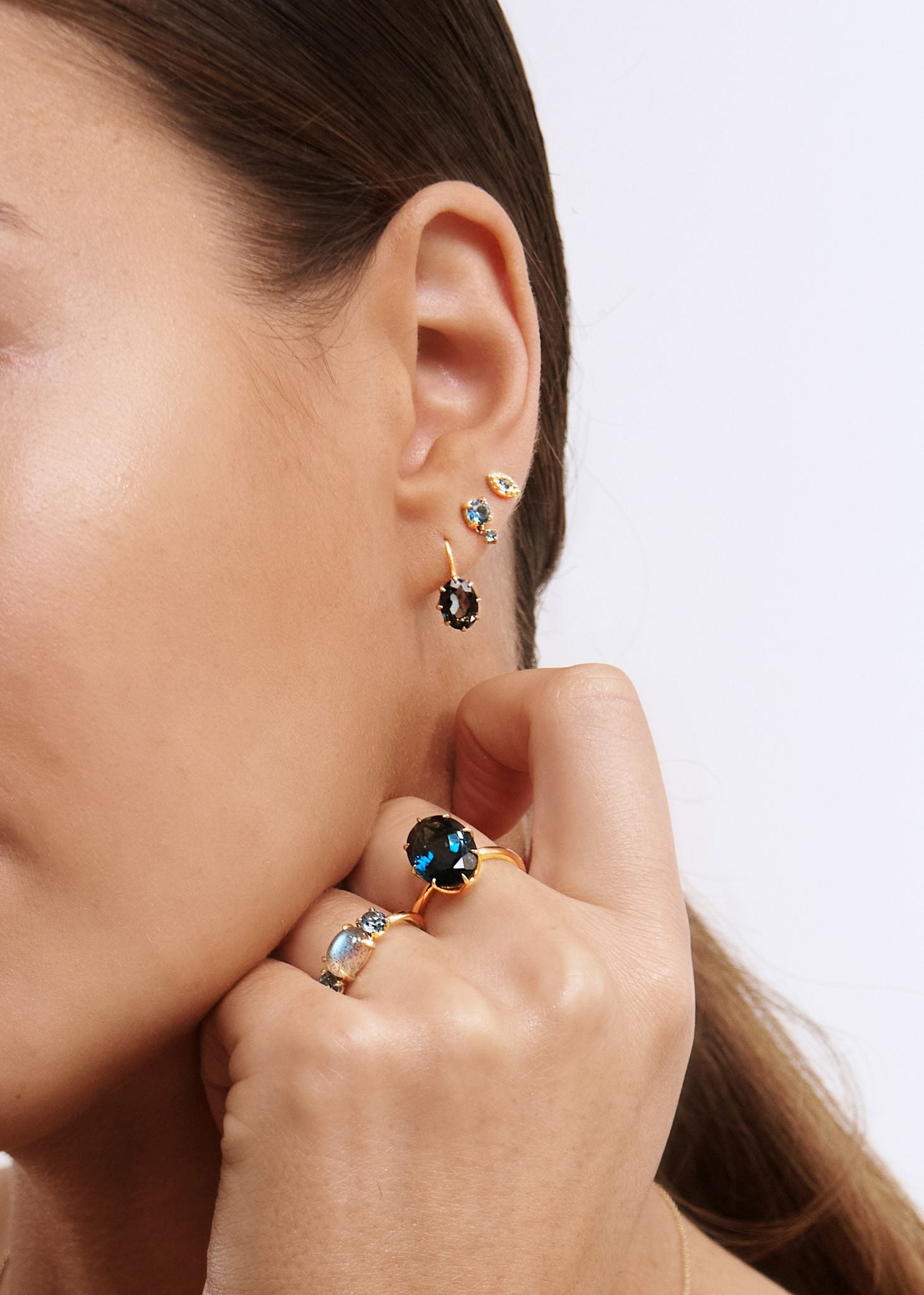 ung kvinde med ringe i 10 karat guld med blå topas og gylden rutil kvarts ædelsten fra carré jewellery